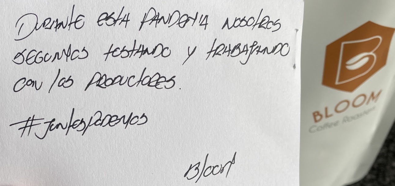 Behind one of the pictures, a note said, “During this pandemic, we will keep roasting and working with our producers #togetherwecan -Bloom” Photo by of Manuel Sanchez-Palacios.